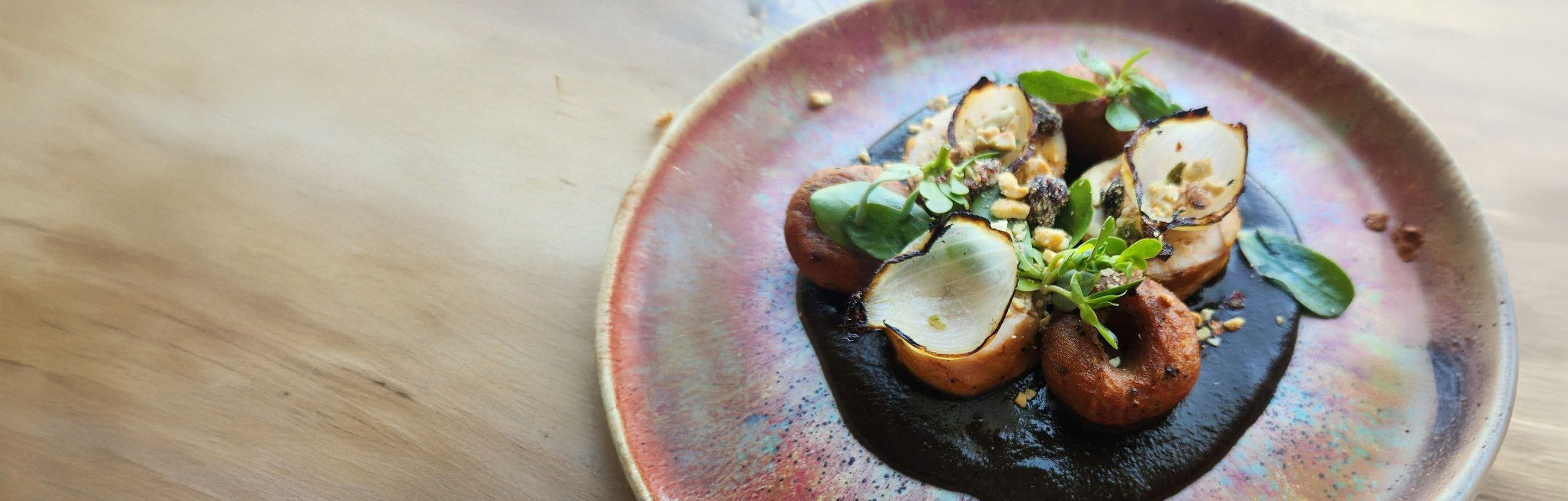 wild acres duck, plantain chochoyotes, nixta mole, granola