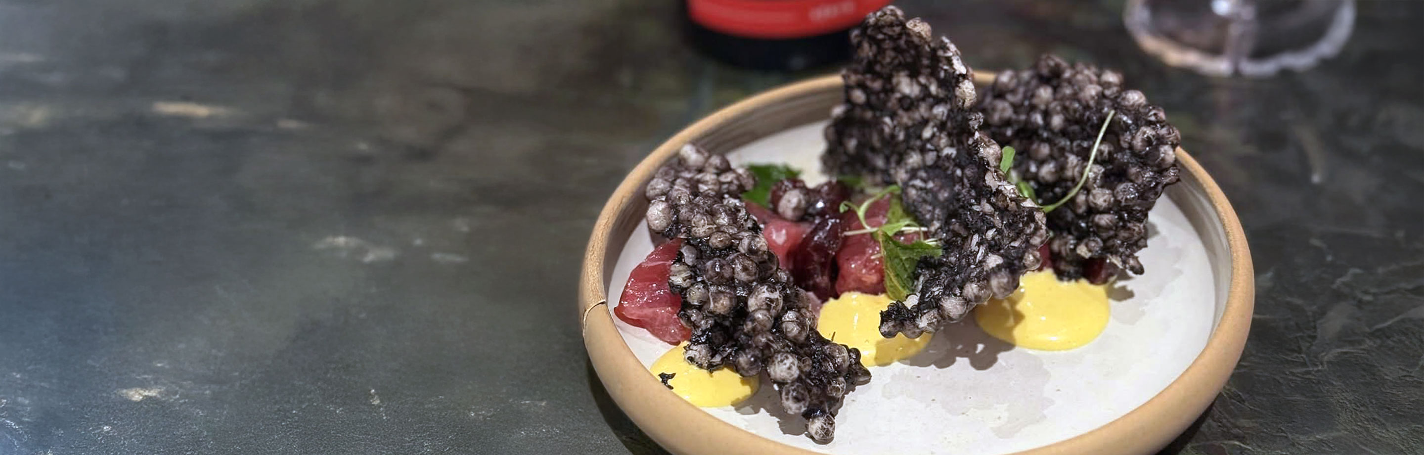 compressed watermelon, furikake, puffed rice, aleppo